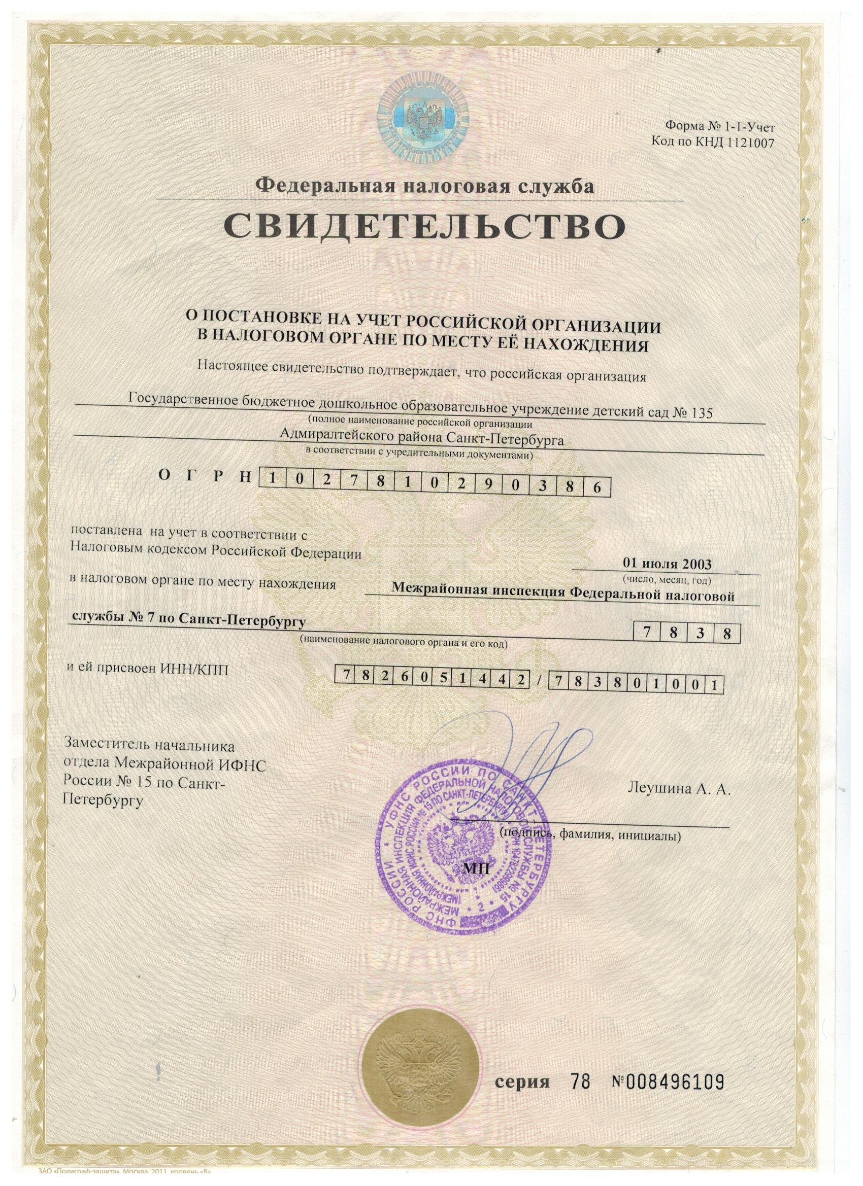 Свидетельство о постановке на налоговый учет